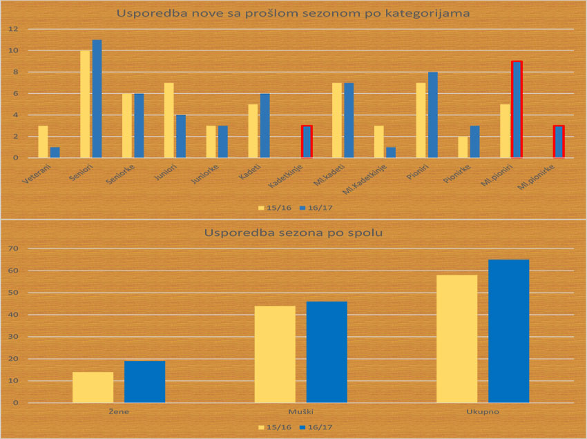 Kadetkinje +3, ali mlađe kadetkinje -2, što daje +1; curke iz mlađih kadetkinja su se prelile u kadetkinje, ali ipak je jedna više