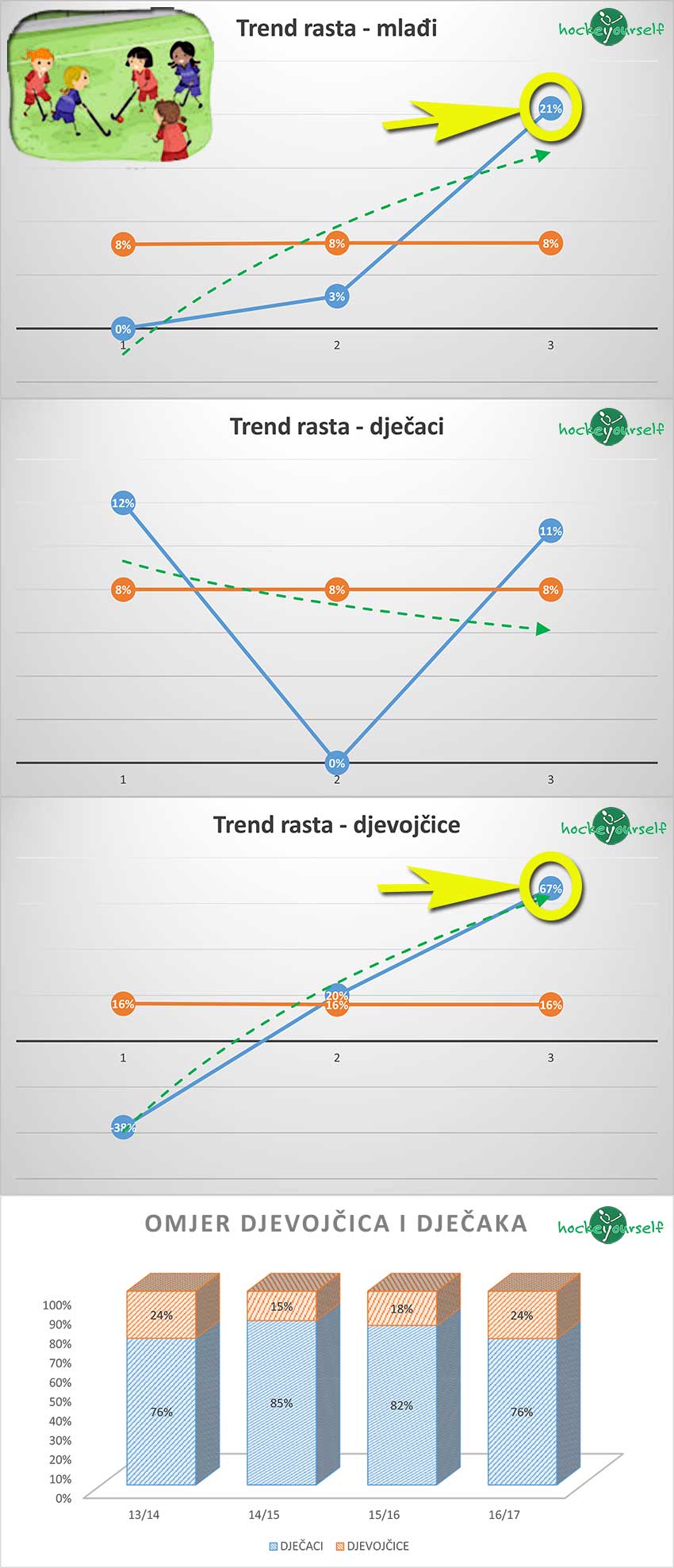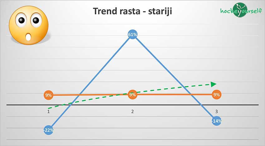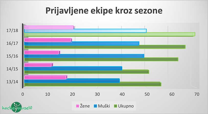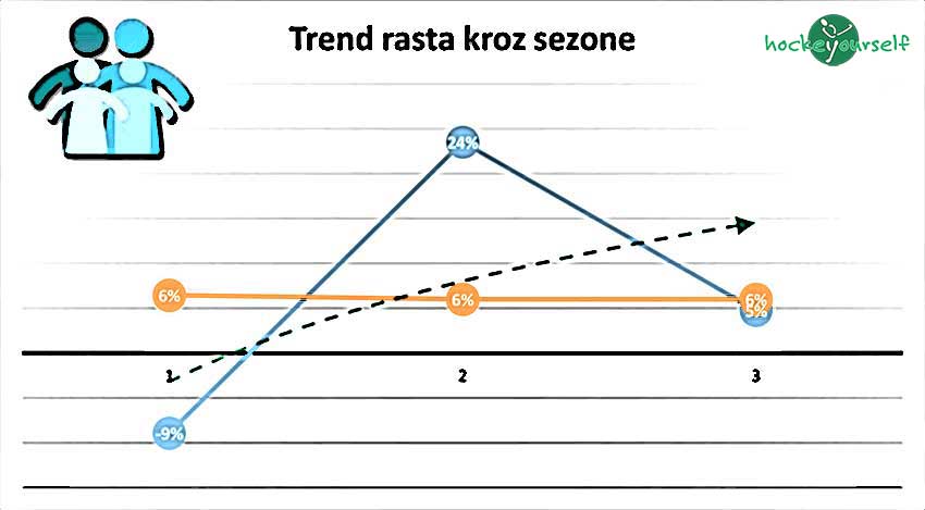 Slika gore pokazuje globalne trendove u hokeju i uz određena "divljanja", na koncu dobivamo trend porasta od 6% koji se, nadamo se, sada stabilizirao (daj Bože da se i poveća u narednim sezonama) i ako nastavimo tim trendom sljedeće sezone 17/18 bi trebali imati 4 ekipe više, 3 muške i 1 žensku.