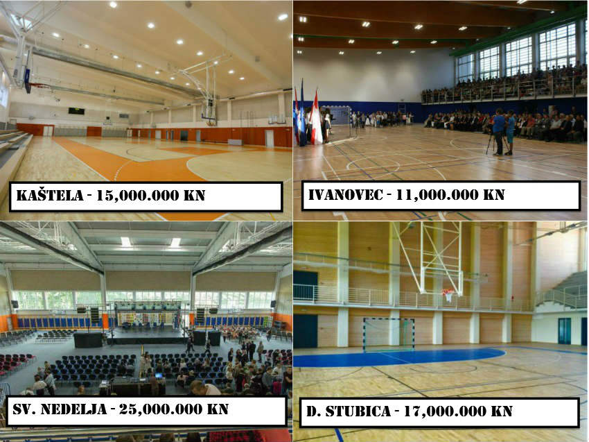 Najjeftinija, a da ima dimenzije za dvoranski hokej, koštala je 11 milijuna kuna. Ali ima samo četiri svlačionice. Druga je koštala 15 milja, a može se podijeliti na dva rukometna/tri košarkaška terena. I ima dovoljan broj svlačionica. Donja Stubica je pet godina čekala na gradnju dvorane za 17 milijuna kuna, dok je Sveta Nedjelja izgradila dvoranu za 25 milijuna kuna. Cijena je veća jer je niskoenergetska pa će se to kompenzirati (valjda) nakon nekoliko godina korištenja.