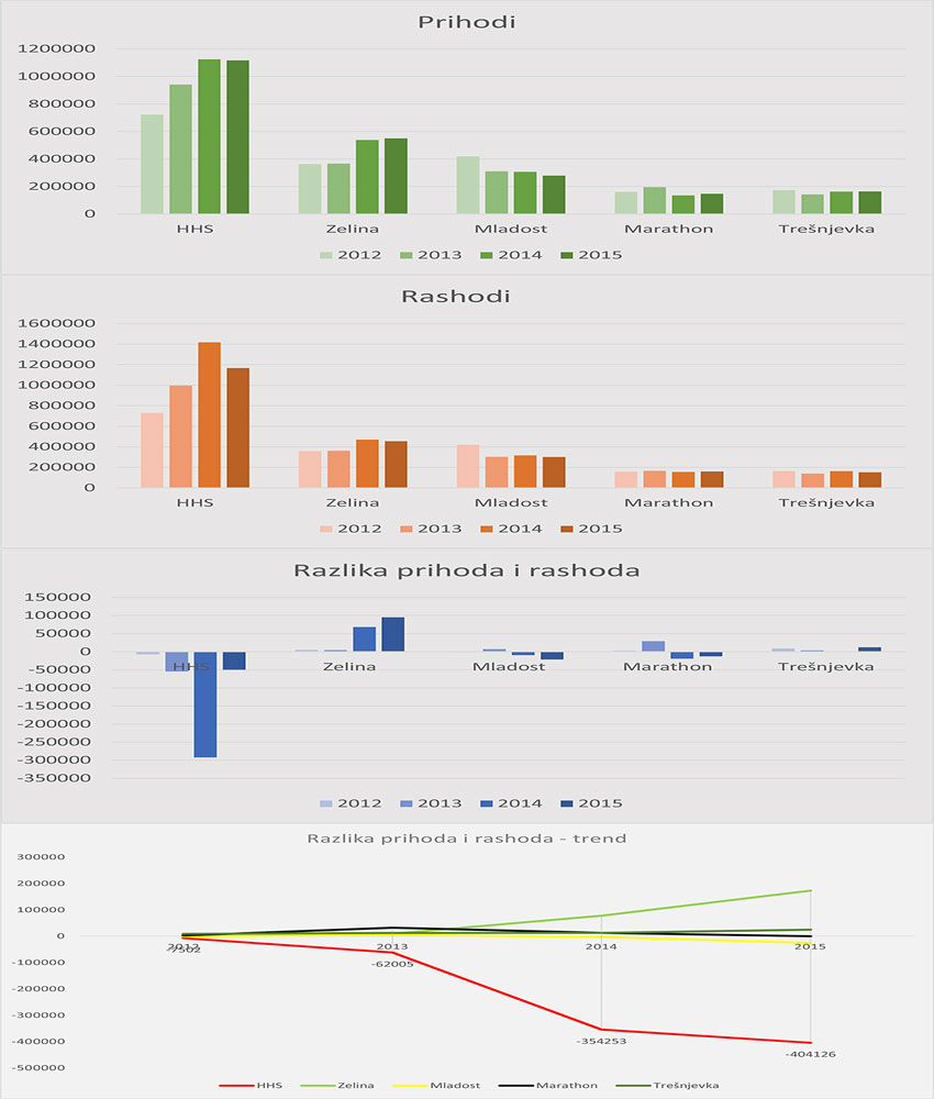 Indikativno je da je u tom periodu Zelina najviše porasla i na kraju perioda ostvarila najveći plus dok je Mladost počela padati i završila u minusu iako je proračun Mladost iz 2012 bio veći od proračuna Zeline. Već sljedeće godine Zelina je prešišala Mladost da bi na kraju promatranog razdoblja imala duplo veći proračun od Mladosti. Marathon radi s onim što ima dok Trešnjevka marljivo kao hrčak skuplja lovicu iz godine u godinu. Ne puno, ali srcu drago.