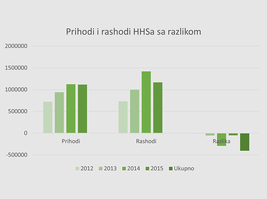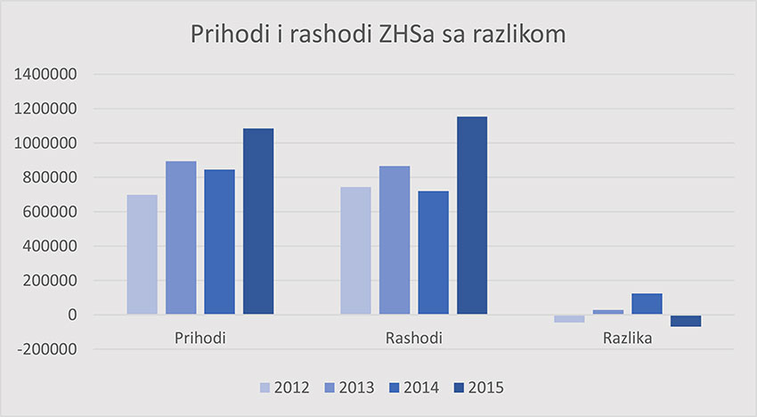Ali da budem transparentan, evo i grafa druge naše organizacije koja se financira iz javnih izvora, ZHS-a koji je na kraju 2015 završio u plusu od nekih 39.000 iako mu je proračun za 2015 za samo 30.000 bio manji od HHS-a.